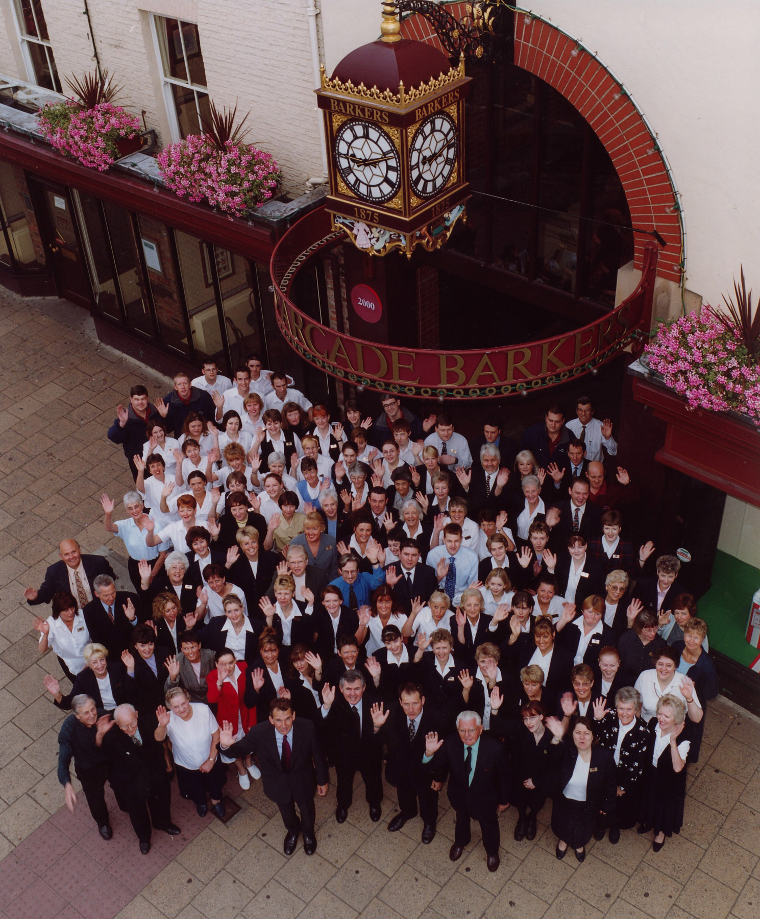 To commemorate the Millennium, the Barkers clock was added above the entrance to the arcade. Custom made by Gillet and Johnson clockmakers of Croydon, it has gilded detailing with various scenes depicting Barkers history and association with tailoring, furniture and hospitality.